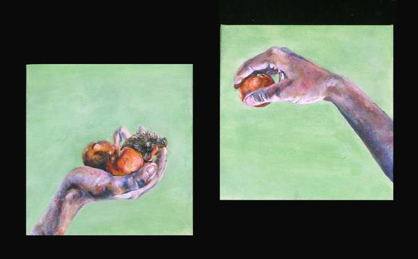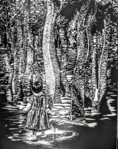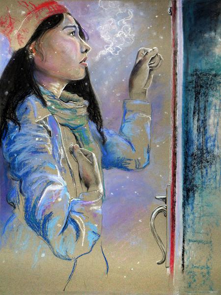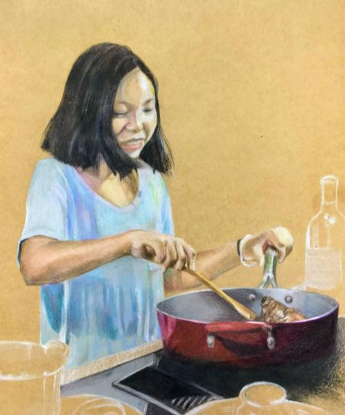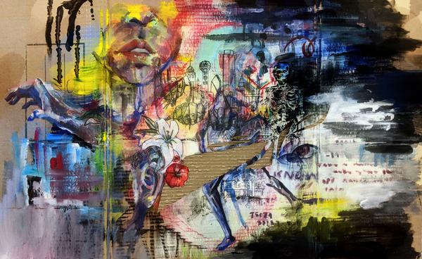 Media: oil paint, intaglio etching, soft pastel, acrylic paint, cardboard, watercolor
